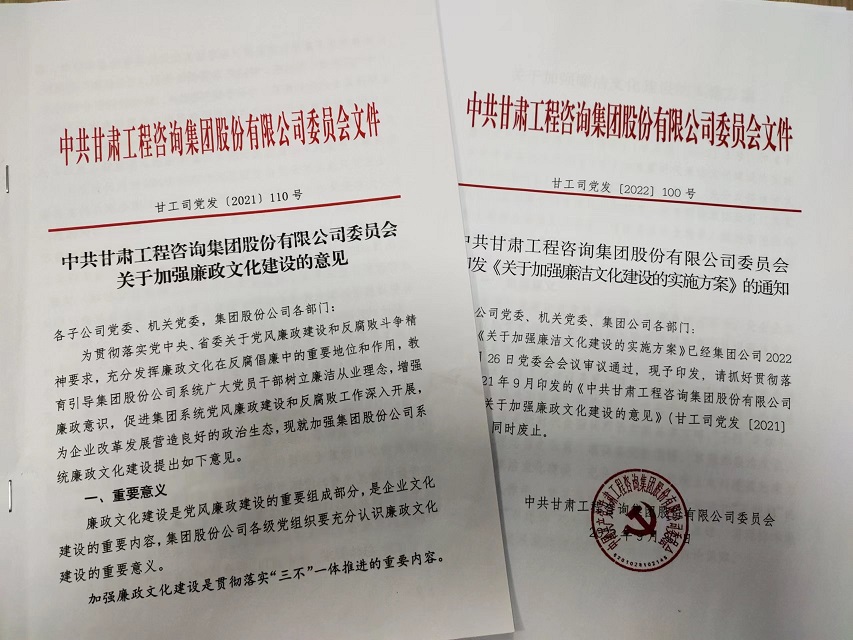 作為新組建的產(chǎn)業(yè)集團(tuán),甘肅工程咨詢(xún)集團(tuán)把資產(chǎn)整合、產(chǎn)業(yè)耦合和文化融合作為集團(tuán)公司組建的重要內(nèi)容,其中讓廉潔文化建設(shè)在企業(yè)文化建設(shè)中先行一步,早安排早部署,2021年9月集團(tuán)公司黨委研究印發(fā)《關(guān)于加強(qiáng)廉政文化建設(shè)的意見(jiàn)》,在中共中央辦公廳《關(guān)于加強(qiáng)新時(shí)代廉潔文化建設(shè)的意見(jiàn)》和省委《實(shí)施方案》印發(fā)后,又及時(shí)對(duì)標(biāo)、查缺補(bǔ)漏,2022年9月修訂印發(fā)《關(guān)于加強(qiáng)廉潔文化建設(shè)的實(shí)施方案》,為新時(shí)代集團(tuán)公司加強(qiáng)廉潔文化建設(shè)提供了指導(dǎo)。自組建以來(lái),集團(tuán)公司廉潔文化建設(shè)力求在“內(nèi)化于心”上下功夫,在“外化于行”上求實(shí)效,引導(dǎo)干部職工廉潔從業(yè),廉潔用權(quán),積極營(yíng)造“崇廉、尚廉、倡廉、守廉”的企業(yè)風(fēng)尚和發(fā)展氛圍。