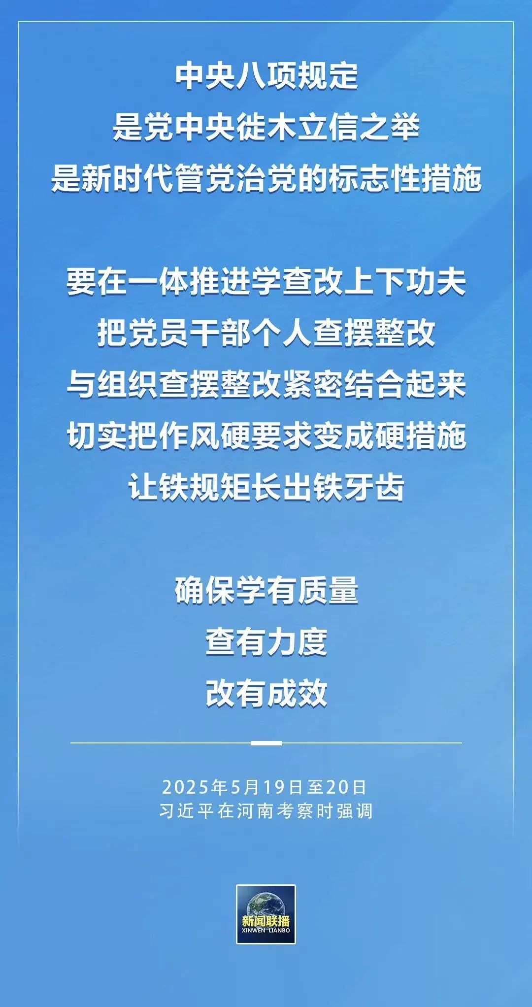 習(xí)近平總書記在河南考察時(shí)對(duì)深入貫徹中央八項(xiàng)規(guī)定精神學(xué)習(xí)教育提出明確要求,強(qiáng)調(diào)“要在一體推進(jìn)學(xué)查改上下功夫”“確保學(xué)有質(zhì)量、查有力度、改有成效”。