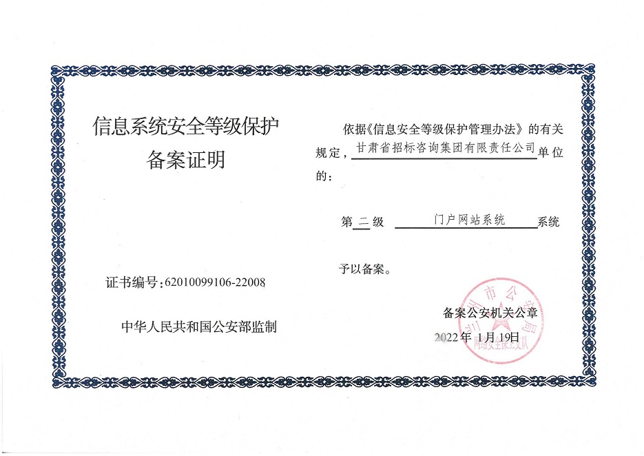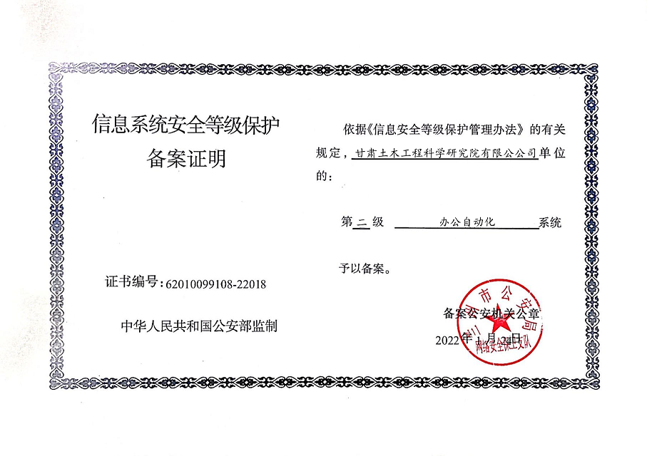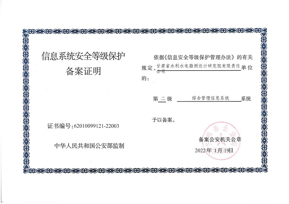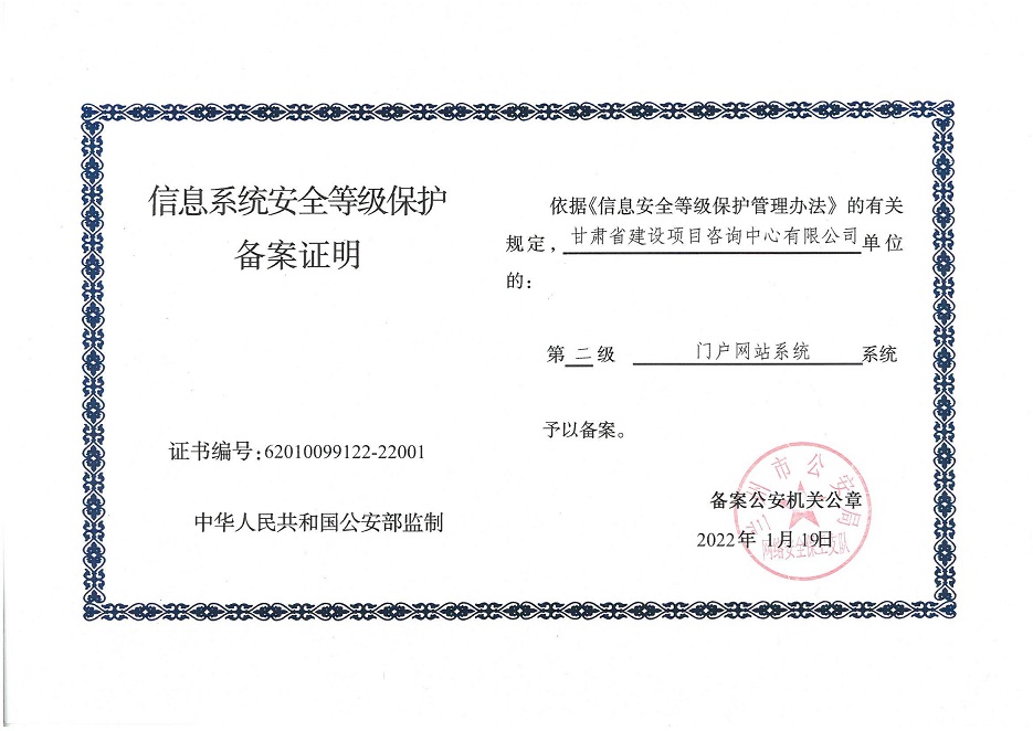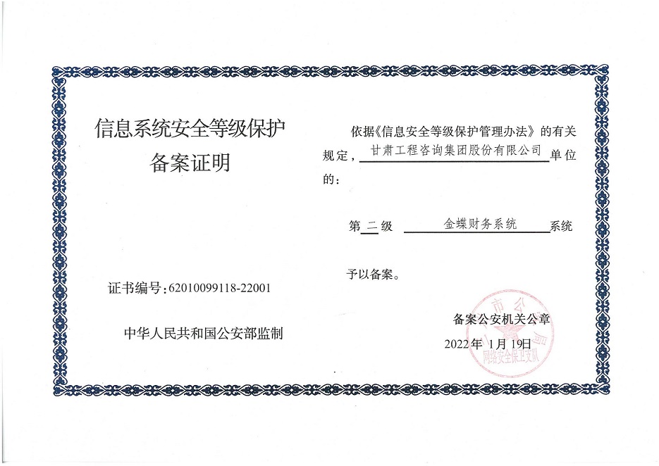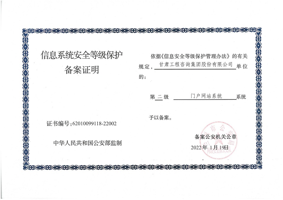 甘肅工程咨詢集團(tuán)股份公司信息系統(tǒng)通過安全等級保護(hù)2.0備案認(rèn)證