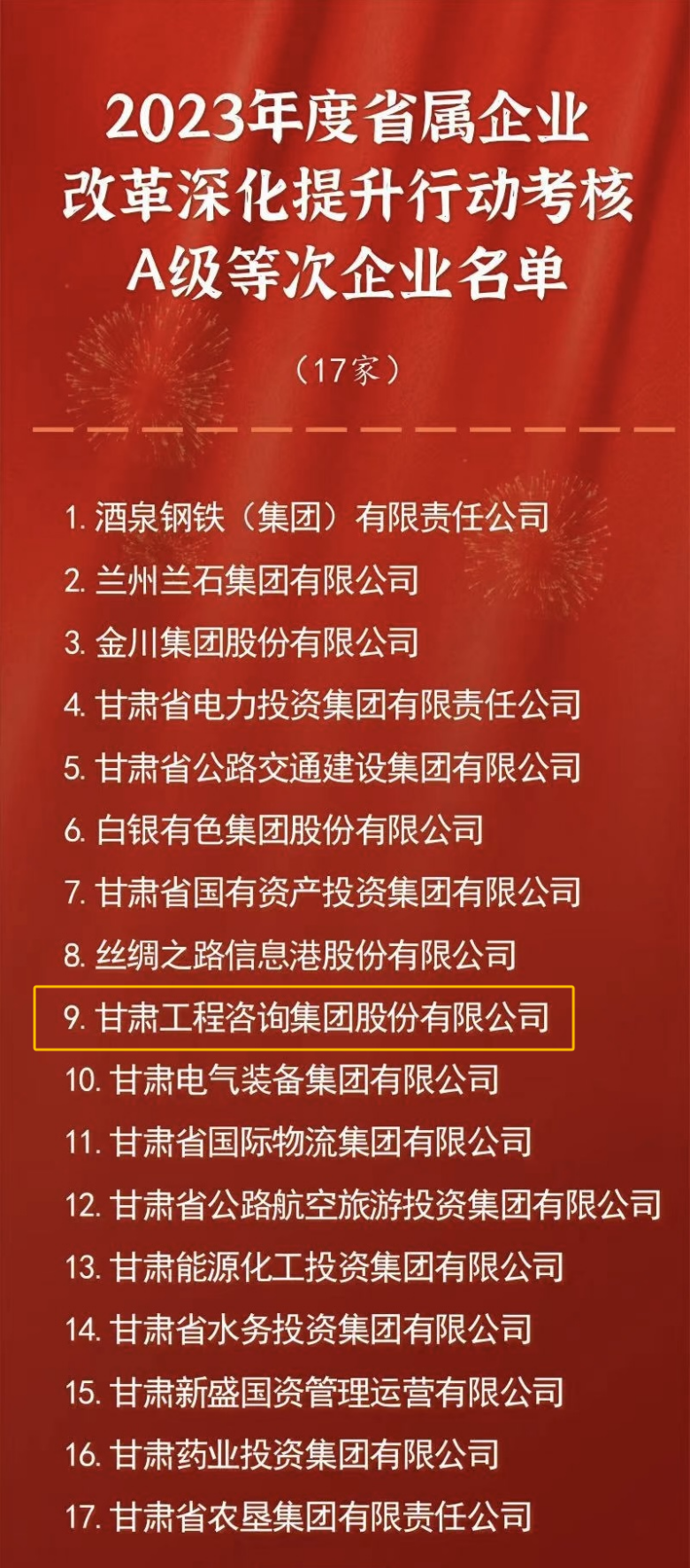 根據(jù)《2023年全省國企改革深化提升行動考核評估工作方案》,2023年度省屬企業(yè)改革深化提升行動考核結果已經(jīng)省政府國資委主任辦公會審議通過。A級等次企業(yè)名單如下: