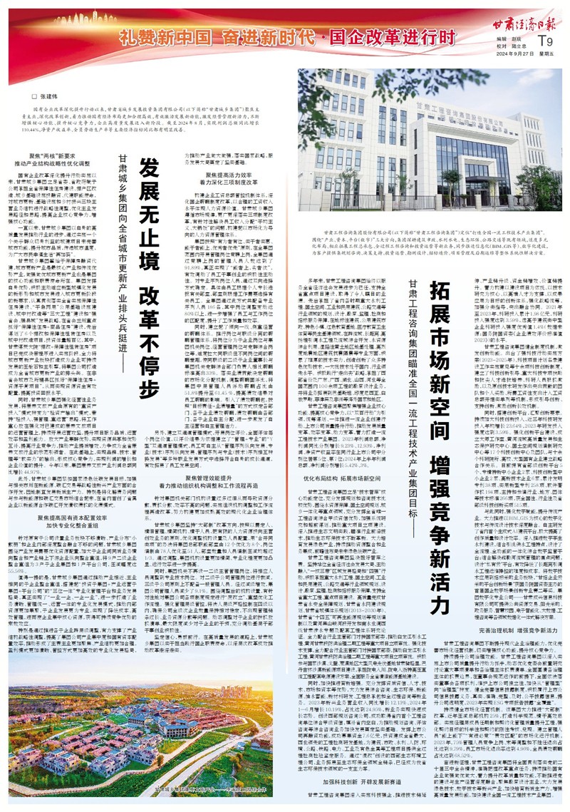 奮進(jìn)新征程,甘肅工程咨詢集團(tuán)將全面貫徹落實(shí)黨的二十屆三中全會精神,準(zhǔn)確把握改革重點(diǎn)任務(wù),持續(xù)推動國有企業(yè)做強(qiáng)做優(yōu)做大,著力提升改革質(zhì)量和效能,不斷推進(jìn)黨的建設(shè)與生產(chǎn)經(jīng)營深度融合,聚焦勘察設(shè)計(jì)主業(yè),大力發(fā)展綠色技術(shù)、數(shù)字技術(shù)等新興產(chǎn)業(yè),加快培育新質(zhì)生產(chǎn)力,增強(qiáng)高質(zhì)量發(fā)展動能,加快建設(shè)全國一流工程技術(shù)產(chǎn)業(yè)集團(tuán)。