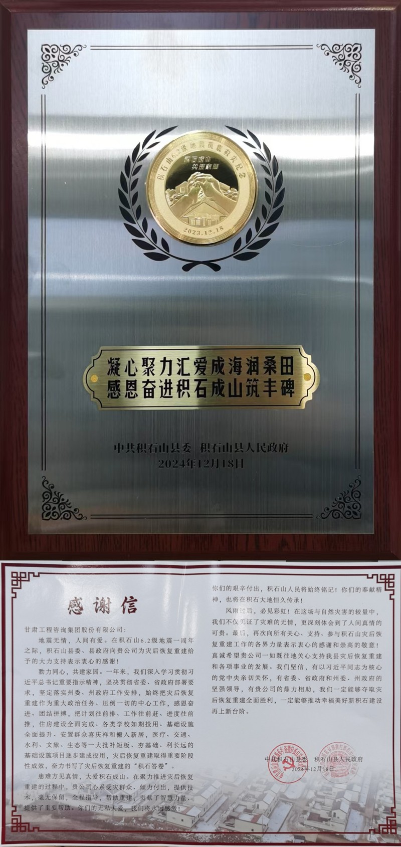 1月22日,時(shí)值北方農(nóng)歷小年。中共積石山縣委、積石山縣人民政府為甘肅工程咨詢(xún)集團(tuán)送來(lái)感謝信,對(duì)甘肅工程咨詢(xún)集團(tuán)在災(zāi)后恢復(fù)重建給予的大力支持表示感謝,并致以節(jié)日問(wèn)候。