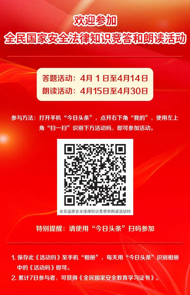 今年是國家安全法頒布施行10周年,4月15日是第十個全民國家安全教育日。為深入貫徹落實(shí)習(xí)近平總書記關(guān)于全面加強(qiáng)國家安全教育的重要指示批示精神,推進(jìn)國家安全法治宣傳教育走深走實(shí),增強(qiáng)全民國家安全意識和法治意識,倡議大家參加全民國家安全法律知識競答和朗讀活動。