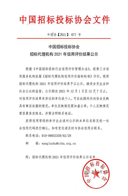近日,在中國招標(biāo)投標(biāo)協(xié)會牽頭組織的2021年招標(biāo)代理機構(gòu)級信用評價認(rèn)證工作中,經(jīng)中招協(xié)委托的第三方信用服務(wù)機構(gòu)(國資委)商業(yè)信用中心及有關(guān)行業(yè)專家評審,招標(biāo)咨詢集團子公司甘肅省招標(biāo)中心有限公司和甘肅金安建設(shè)工程項目管理有限公司獲得2021年招標(biāo)代理機構(gòu)AAA級信用評價最高等級認(rèn)證。