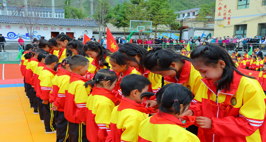 活動現(xiàn)場,在莊嚴激昂的國歌聲中舉行了升國旗儀式。簡單而又隆重的入隊儀式上,鮮紅的隊旗迎風飄揚,隨著入隊隊員名單的宣布,許多一年級的同學成為了光榮的中國少年先鋒隊隊員,并由高年級的少先隊員為他們戴上了鮮艷的紅領巾。隨后,大隊輔導員帶領新隊員宣誓,響亮的呼號聲“時刻準備著”響徹校園上空,集中展示了新時代少先隊員積極向上的精神風貌,全體師生為他們送上最深的祝福。最后,新隊員代表發(fā)言,標準的隊禮、堅定的眼神、稚嫩的聲音表達了最大的決心,號召全體新隊員要在星星火炬的指引下刻苦讀書,從小聽黨話、感黨恩、跟黨走,努力成長為中國特色社會主義事業(yè)建設者和接班人。