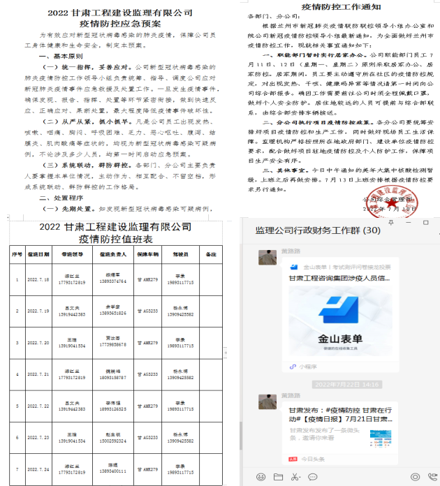 統(tǒng)籌部署,扎牢戰(zhàn)疫“防控網(wǎng)”。7月10日,面對本輪嚴(yán)峻復(fù)雜的疫情防控形勢,建筑設(shè)計院監(jiān)理公司黨支部高度重視,迅即行動,搶抓“時間窗口”,建立完善疫情防控預(yù)案,印發(fā)《疫情防控工作通知》,落實(shí)機(jī)關(guān)職能部門居家辦公要求,統(tǒng)籌安排項(xiàng)目駐地疫情防控、生產(chǎn)推進(jìn)及員工生活保障等各項(xiàng)工作;配套制定《監(jiān)理公司疫情期間值班表》,領(lǐng)導(dǎo)班子成員輪流帶班,中層管理干部、后勤車輛排班值守,靠實(shí)班子、部門、員工“三方責(zé)任”,對員工異常情況每日排查,扎牢戰(zhàn)疫“防控網(wǎng)”。