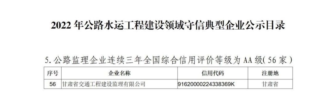 近日,交通運(yùn)輸部公布了《關(guān)于2022年公路水運(yùn)工程建設(shè)領(lǐng)域守信典型企業(yè)目錄的公示》對獲評公路水運(yùn)工程建設(shè)領(lǐng)域守信典型的93家設(shè)計企業(yè)、93家施工企業(yè)、56家監(jiān)理企業(yè)予以公示。甘肅省6家企業(yè)榜上有名,甘肅省交通工程建設(shè)監(jiān)理有限公司是我省唯一一家上榜的監(jiān)理企業(yè)。