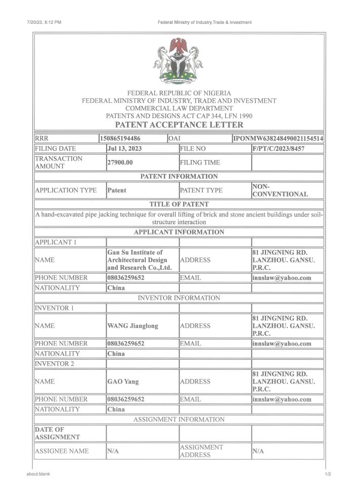 日前,非盟知識(shí)產(chǎn)權(quán)局對(duì)省建筑設(shè)計(jì)院王江龍等申報(bào)的“土-結(jié)構(gòu)相互作用下磚石結(jié)構(gòu)古建筑整體頂升手掘式頂管技術(shù)”(A hand-excavated pipe jacking technique for overall lifting of brick and stone ancient buildings under soil-structure interaction)進(jìn)行授權(quán),為省建筑設(shè)計(jì)院后續(xù)承接援外項(xiàng)目及國(guó)外項(xiàng)目給予了堅(jiān)實(shí)的技術(shù)支撐。