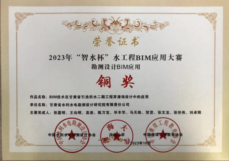 近日,中國水利水電勘測設計協(xié)會發(fā)布了2023年“智水杯”水工程BIM應用大賽獲獎項目,省水電設計院申報的《BIM技術在甘肅省引洮供水二期工程棄渣場設計中的應用》獲得勘測設計MIM應用銅獎。