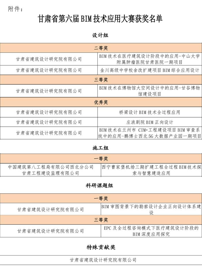 近日,甘肅省第六屆BIM技術(shù)應(yīng)用大賽落下帷幕,省建筑設(shè)計院選送的9項(xiàng)作品,經(jīng)過層層篩選、答辯評審,最終在185個參賽作品中脫穎而出,并分別獲獎。省建筑設(shè)計院榮獲特殊貢獻(xiàn)獎。