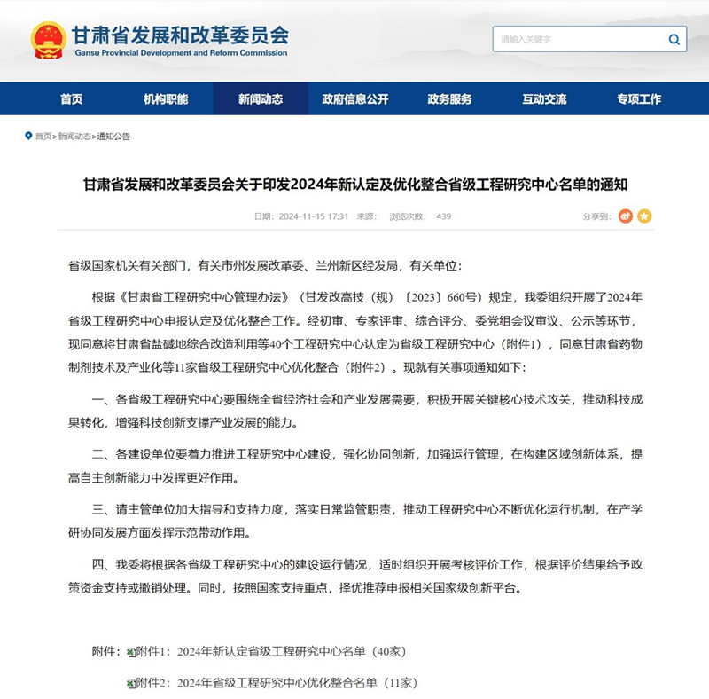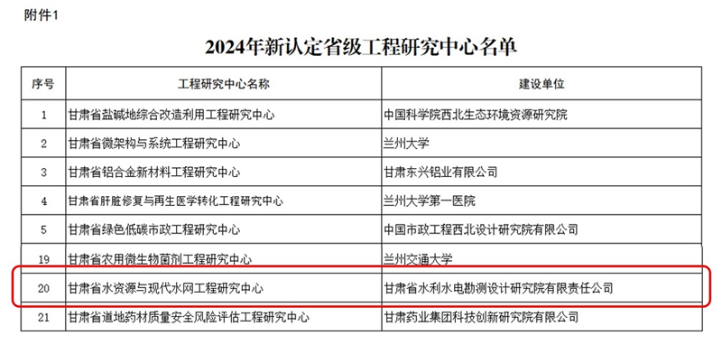 近日,省發(fā)展和改革委員會公布《2024年新認定及優(yōu)化整合省級工程研究中心名單》,省水電設計院申報的“甘肅省水資源與現(xiàn)代水網(wǎng)”成功獲批立項“省級工程研究中心”,標志著公司在水利工程科研平臺建設方面取得了重大突破。