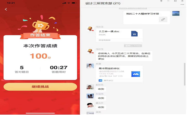 以賽促學(xué),強(qiáng)技礪能精研細(xì)琢。各黨支部組織黨員通過學(xué)習(xí)強(qiáng)國(guó)“黨的二十大精神答題活動(dòng)”“黨的二十大精神應(yīng)知應(yīng)會(huì)百題”等形式,開展線上答題競(jìng)賽,全面檢驗(yàn)黨員干部對(duì)黨的二十大報(bào)告內(nèi)容的掌握程度,進(jìn)一步增強(qiáng)黨員干部對(duì)學(xué)習(xí)黨的二十大精神的認(rèn)識(shí)和重視,推動(dòng)黨的二十大精神入腦入心,鞏固提升學(xué)習(xí)效果,以賽促學(xué)、以知促行,用黨的二十大精神武裝頭腦、指導(dǎo)實(shí)踐、推動(dòng)工作。